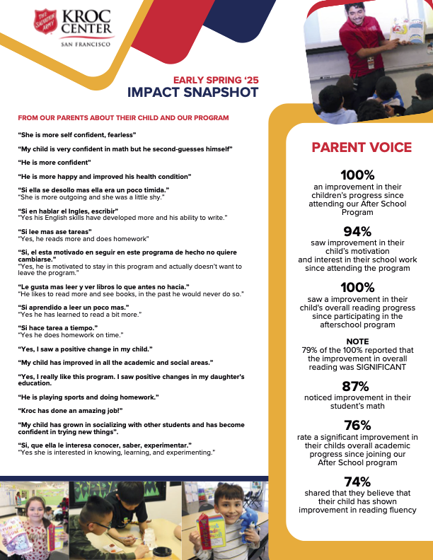 Summer 2025 Weekend Wellness Bag Outcomes Early Spring 2025 Kroc Center After-School Program Results Taylor Choi 2/8/25 Taylor Choi 2/8/25 Bay Area Bright Futures Foundation Awards Grant to The Salvation Army Kroc Center San Francisco Read More